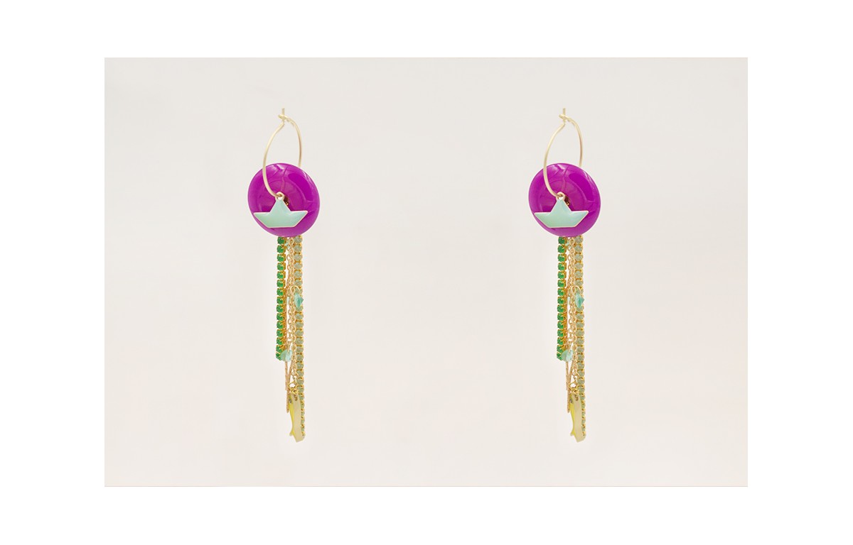 Pendientes aro mediano con disco cuarzo morado, barco esmalte turquesa, fleco cadena strass verde, agua opal. Discos de cristal verde y pez amarillo.