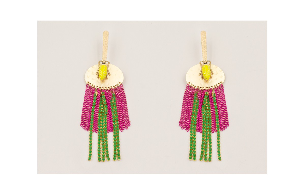Pendientes lámina satinada con escarabajo lima, fleco de cadena eslabón fucsia y strass verde.