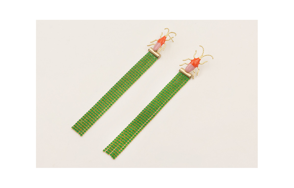 Pendientes perno escarabajo teja y morado con fleco de cadena de strass verde.