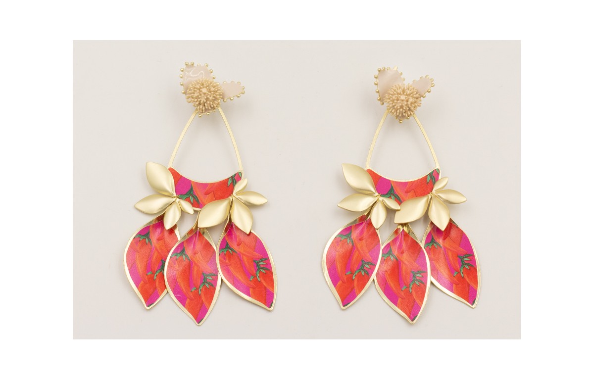 Pendientes perno nenufar y treból esmaltados beige con colgantes lámina pimientos rojos, ramillete hojas dorada mate.