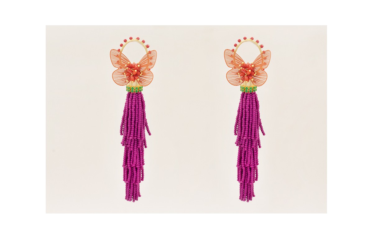 Pendientes fleco abalorio cardenal con mariposas naranjas, burruño tubitos coral, perno bolitas esmaltadas rojas.