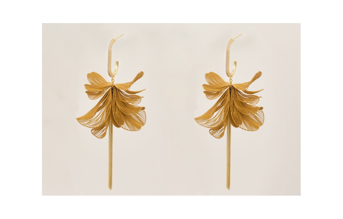 Pendientes flores moldeables mostaza con perno semi ovalado con brillos y fleco cadena cordón.