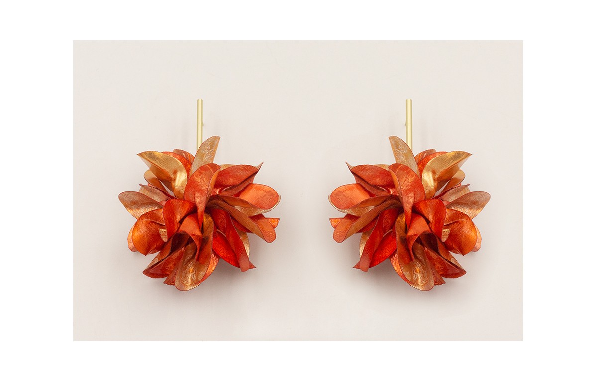 Pendientes perno pivote dorado mate con flor lentejuelas ovaladas naranjas y metal.