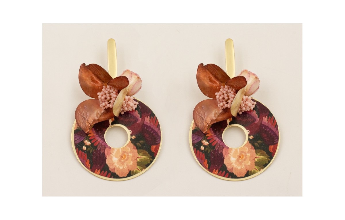 Pendientes disco flores rosas y granates, flor gra