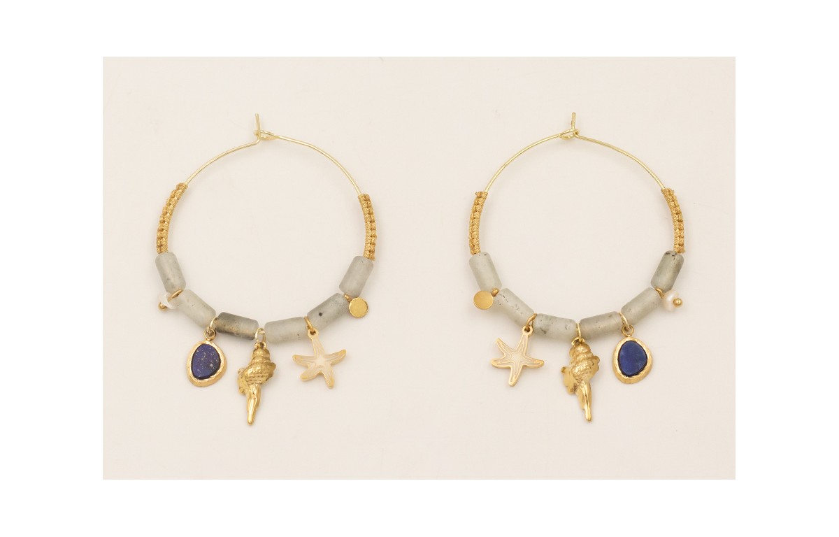Pendientes ACERO INOXIDABLE aro grande con nudo macramé dorado, tubos piedra gris, colgante estrella esmaltada blanca, caracola, piedra azul, chip perla narutal, disco.