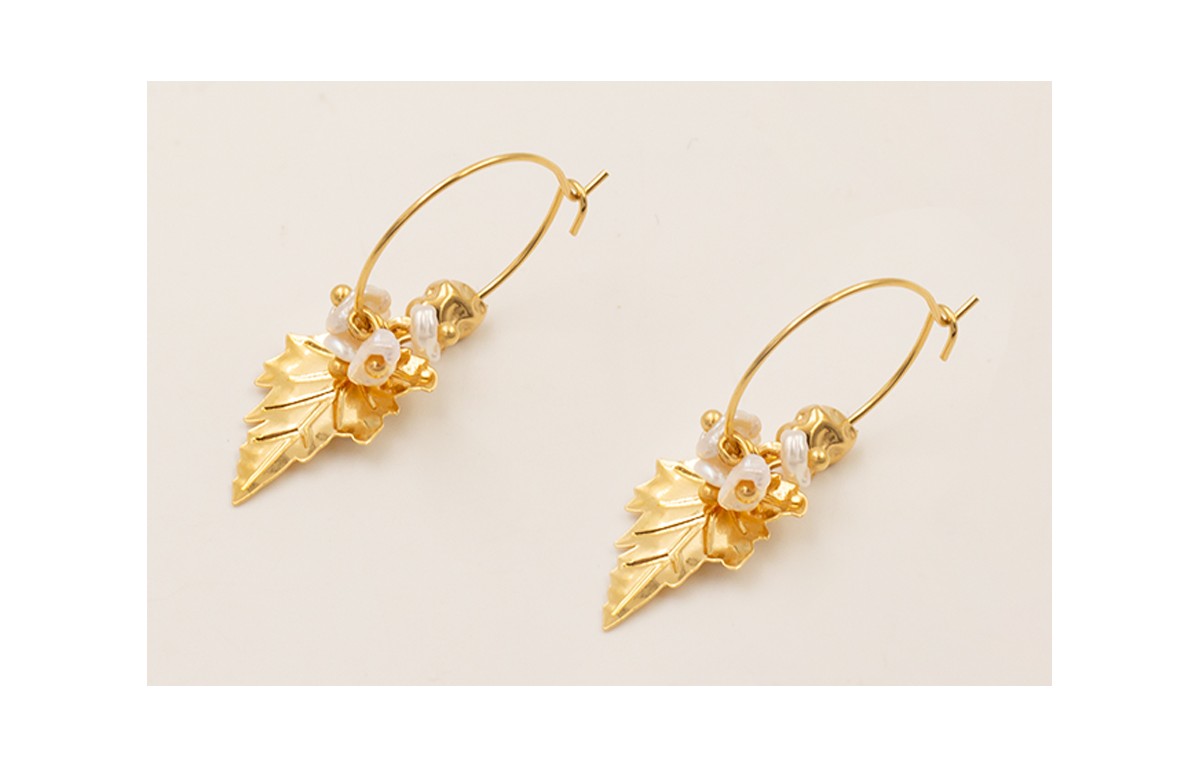 Pendientes aro con colgante hoja, piedra irregular todo con BAÑO ORO 18K y chips madre perla.