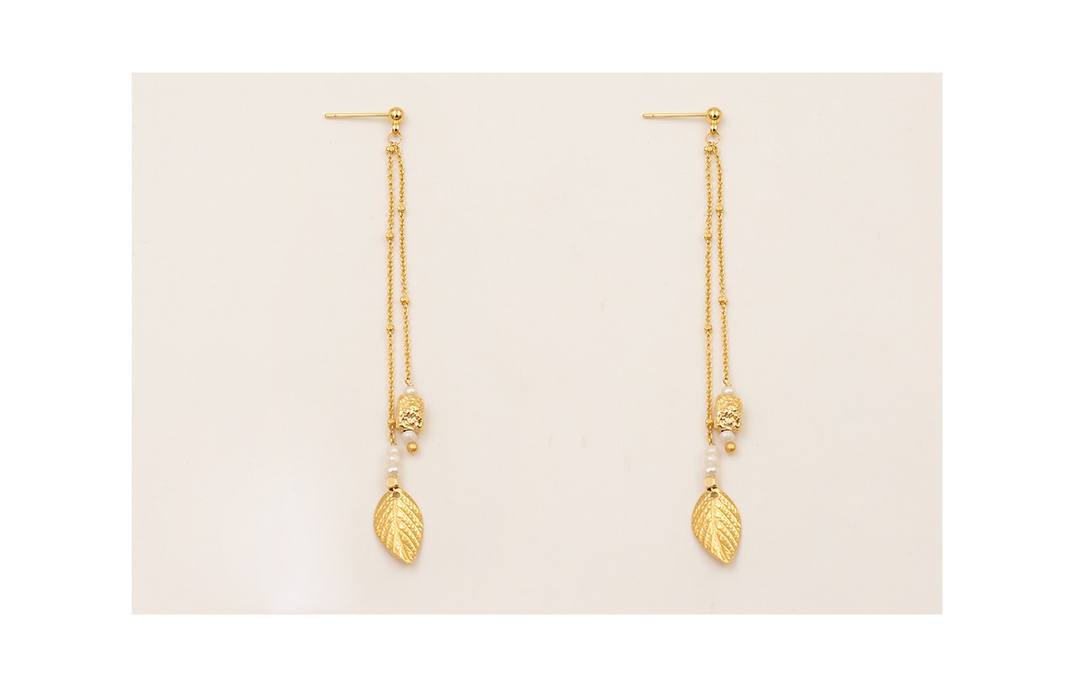 Pendientes cadena bolita intercalada, perno bolita colgante hoja, entrepieza irregular con BAÑO ORO 18K y mini perlas naturales.