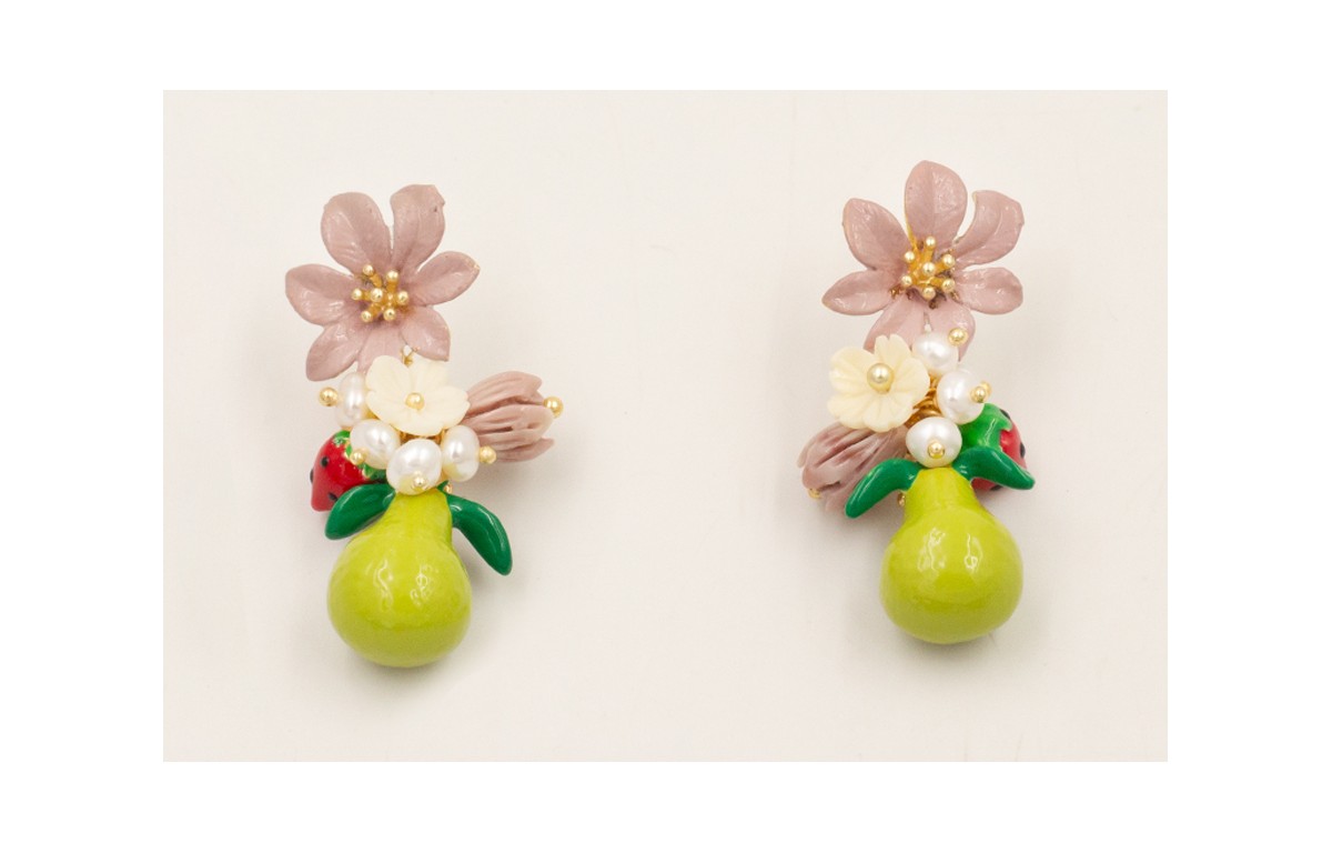 Pendientes flor pintada a mano lila con pera esmaltada, fresa,campanilla lila, campanilla beige de resina polvo coral, burruño perlas naturales.