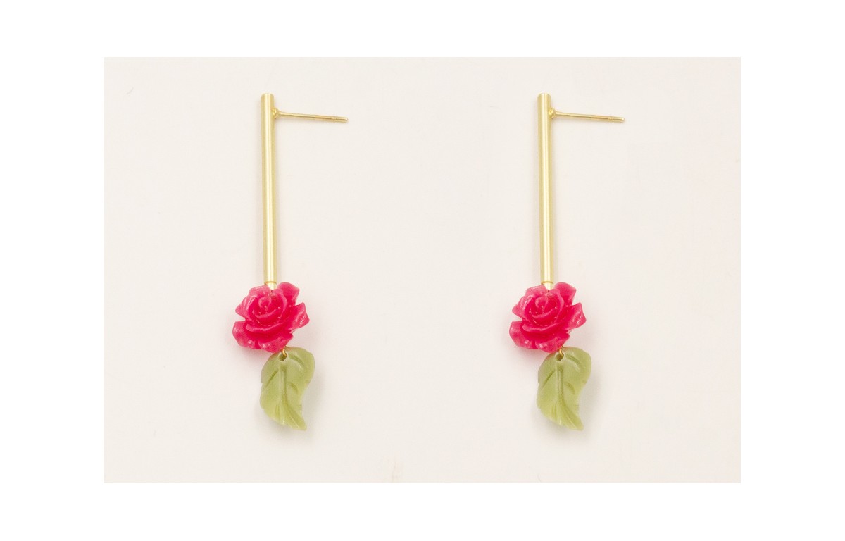 Pendientes plado dorado mate con flores resina coral color frambuesa y colgante hoja verderesina coral color verde.