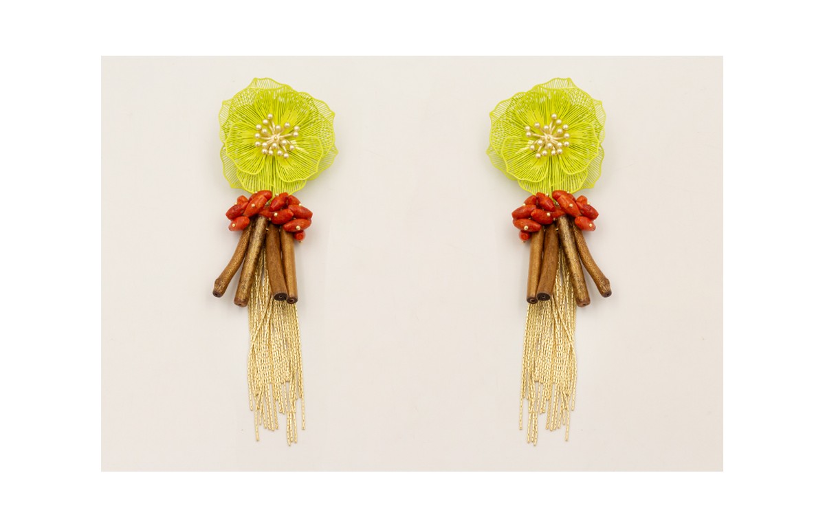 Pendientes flor 2 capas esmaltado lima, burruños ovalos corales con palos coral marrón y flecos dorados mates.