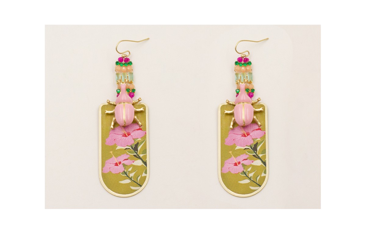 Pendientes gancho sencillo con escarabajo rosa, pieza flores lilas fondo lima y colgante trenzado semipreciosas, cadenas de strass con fleco cadena facetadas frambuesas.