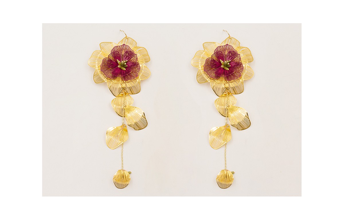 Pendientes flor grande dorada con flor color carde