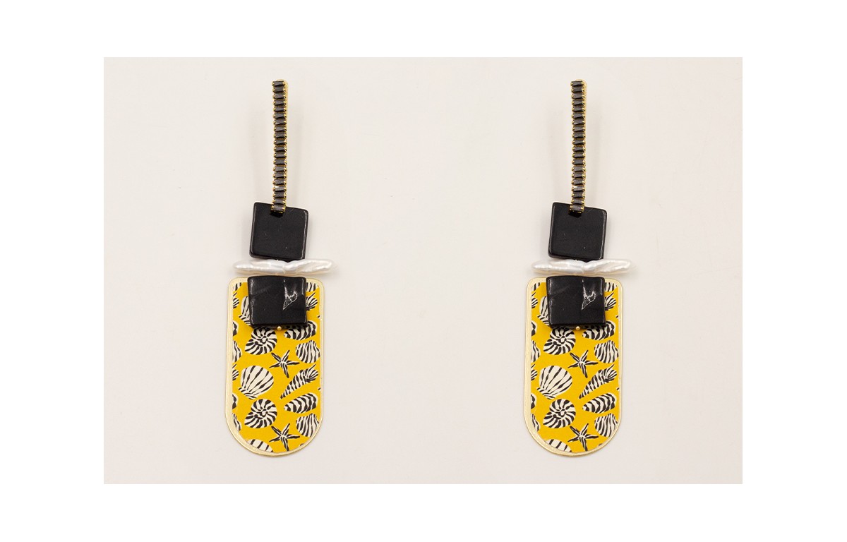 Pendientes perno forrado cadena strass negro, colgante pieza conchas con fonde amarillo, cuadrados madreperla teñida negra y listón perla natural.