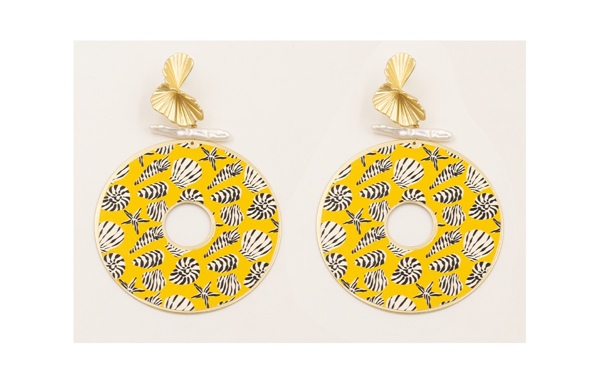 Pendientes disco conchas negras y bancas con fondo amarillo, listón perla natural y perno onda retorcida dorada mate.