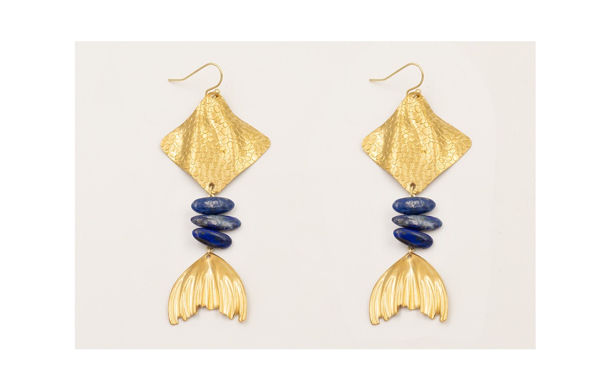 Pendientes manta raya con gotas lapislazuli y cola pez dorada.