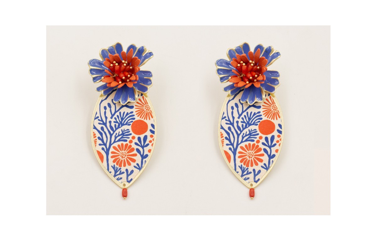 Pendientes pieza ovalada estamapada corales rojos y azulones, perno flors esmaltada azulona con burruño coralitos.
