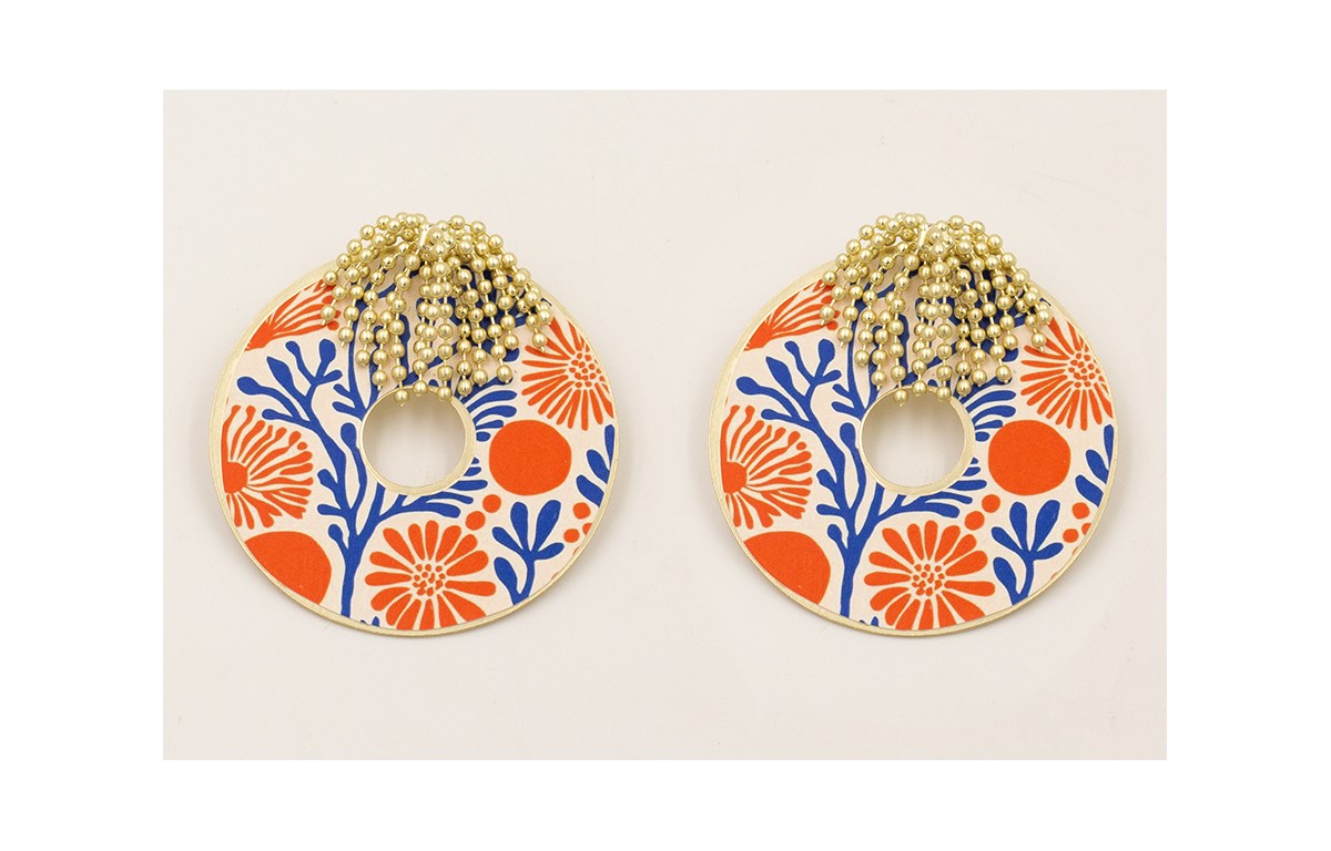 Pendientes fleco ristas bolitas doradas mate con colgante disco estampado azul,coral y blanco.