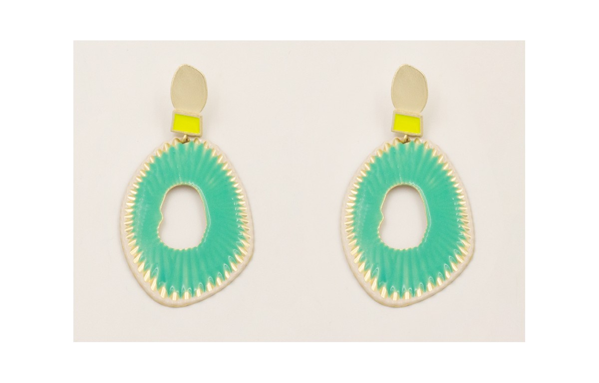 Pendientes perno cuadrado esmlate lima con colgante ovalo estriado esmalte turquesa.