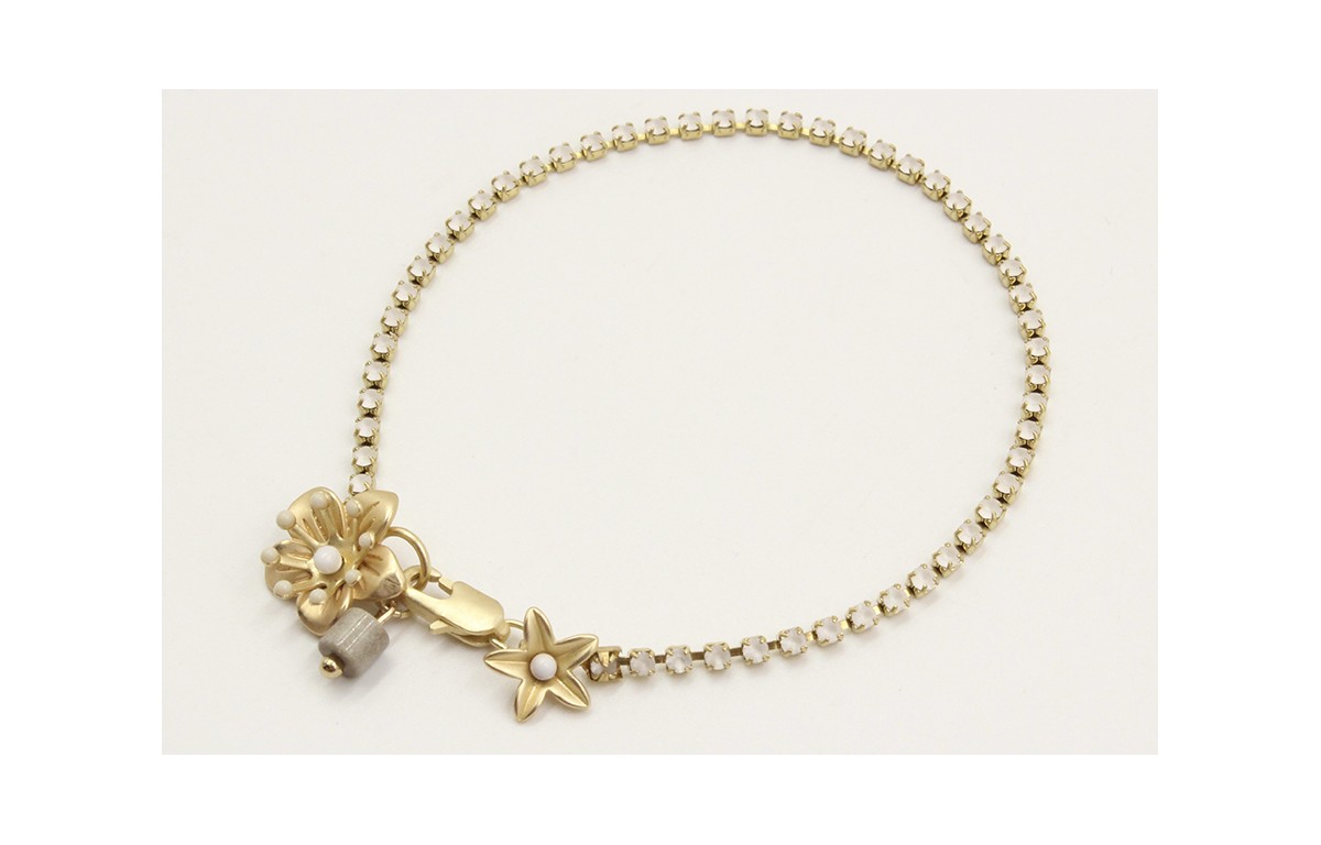 Pulsera cadena de strass color cristal opal con flores en oro mate y piedra color topo. Largo 17cm.