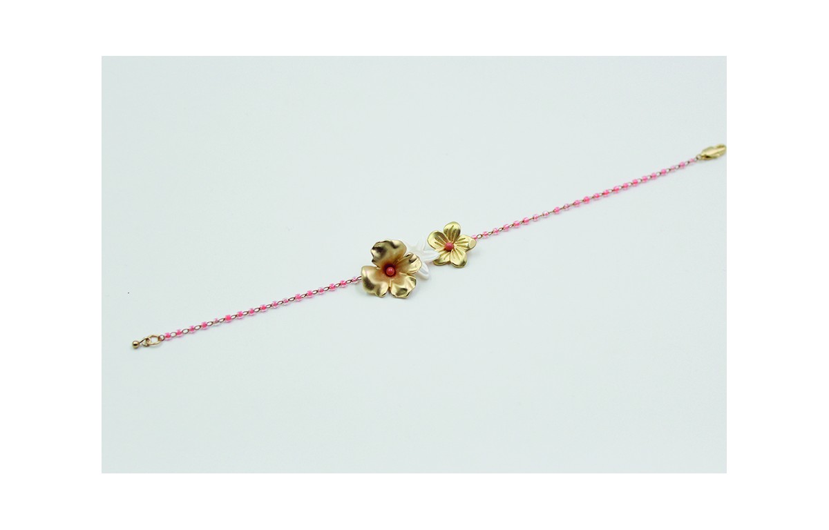 Pulsera cadena miyuki rosa transparente con dos flores en oro mate y una flor de nacar. Largo pulsera 17cm.