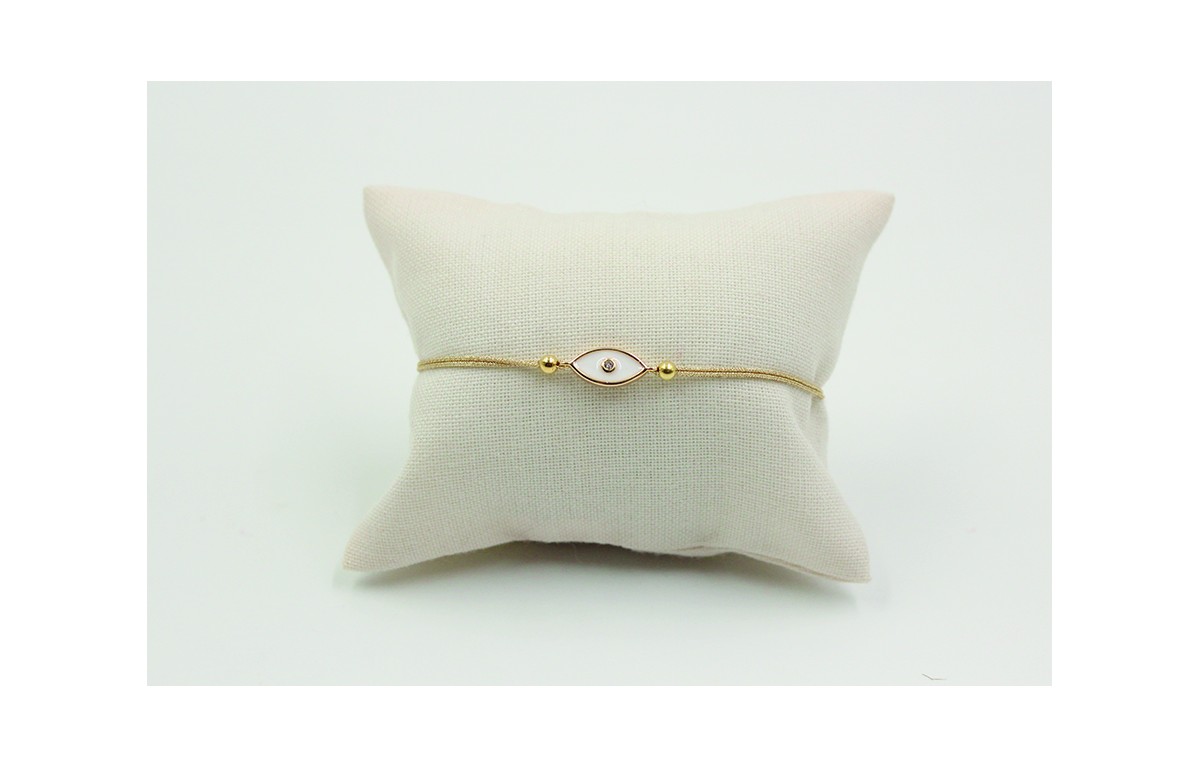 Pulsera de macrame en color oro palido y ojo turco esmaltado en blanco. Pulsera regulable