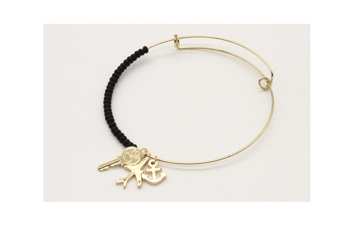 Pulsera rigida corredizo con abalorio negro mate y colgantes de llave, avión y ancla.