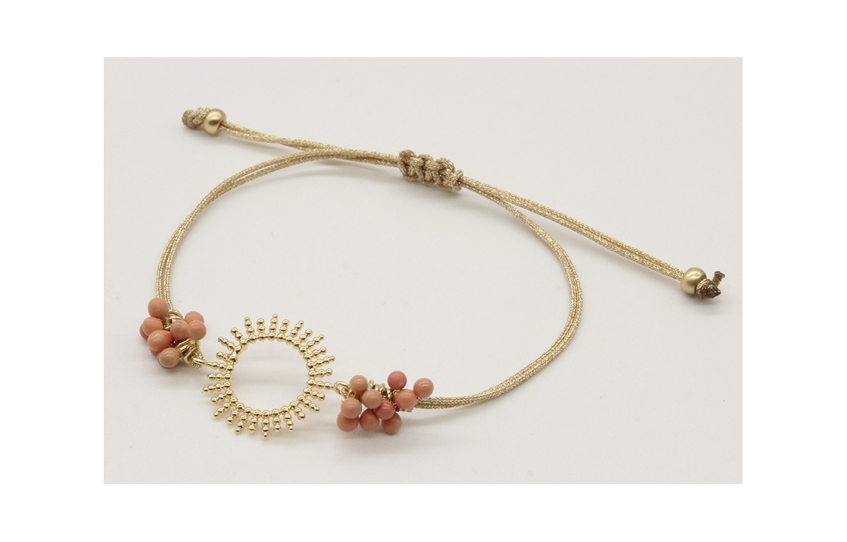 Pulsera macrame oro palido con sol central y alfileres de bola en color rosa. Es regulable.