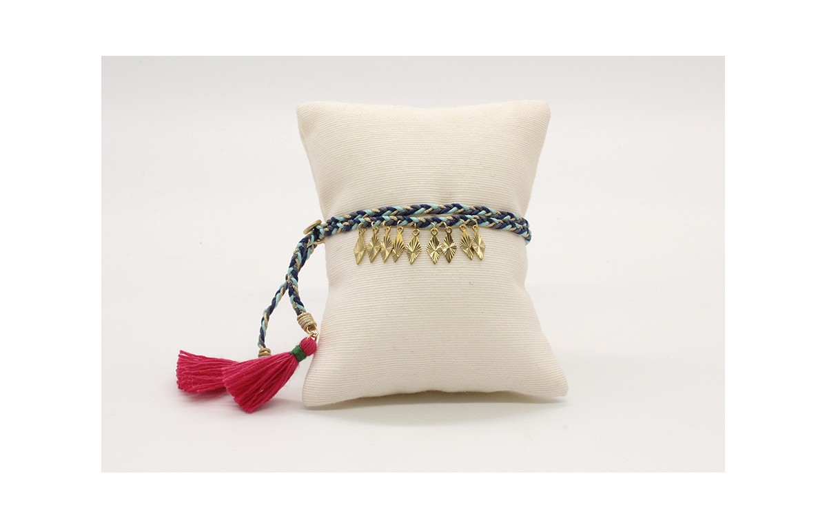 Pulsera trenza macrame azules con rombos en oro y rematada con pompones fucsias.