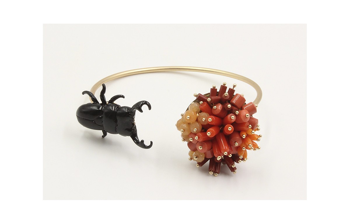 Pulsera rigida con escarabajo esmaltado negro y burruño de piedras naranjas.