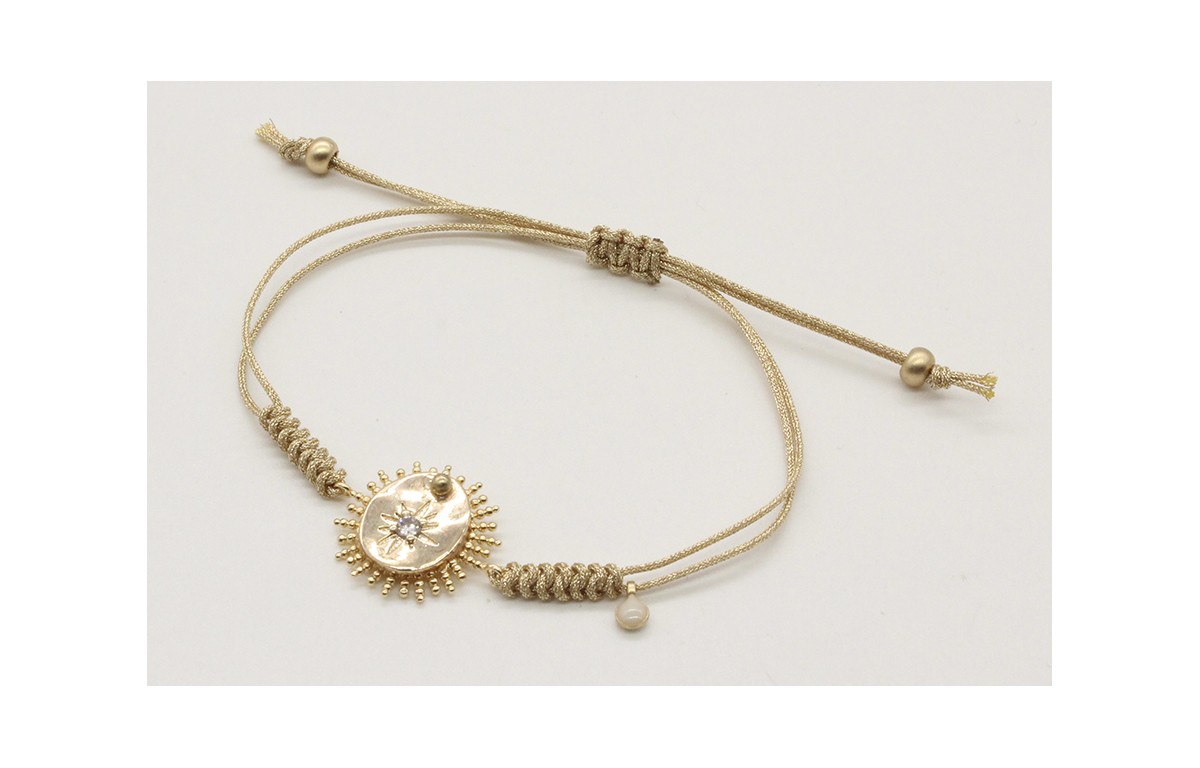 Pulsera nudo serpiente en oro palido con sol y disco estrella microbrillos. Es regulable