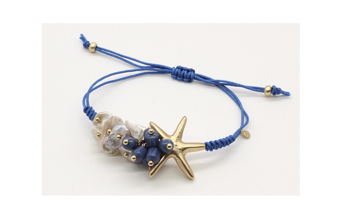 Pulsera nudo serpiente macrame azul con madre-perlas, piedras azules, estrella y concha mejillón en oro mate. Es regulable