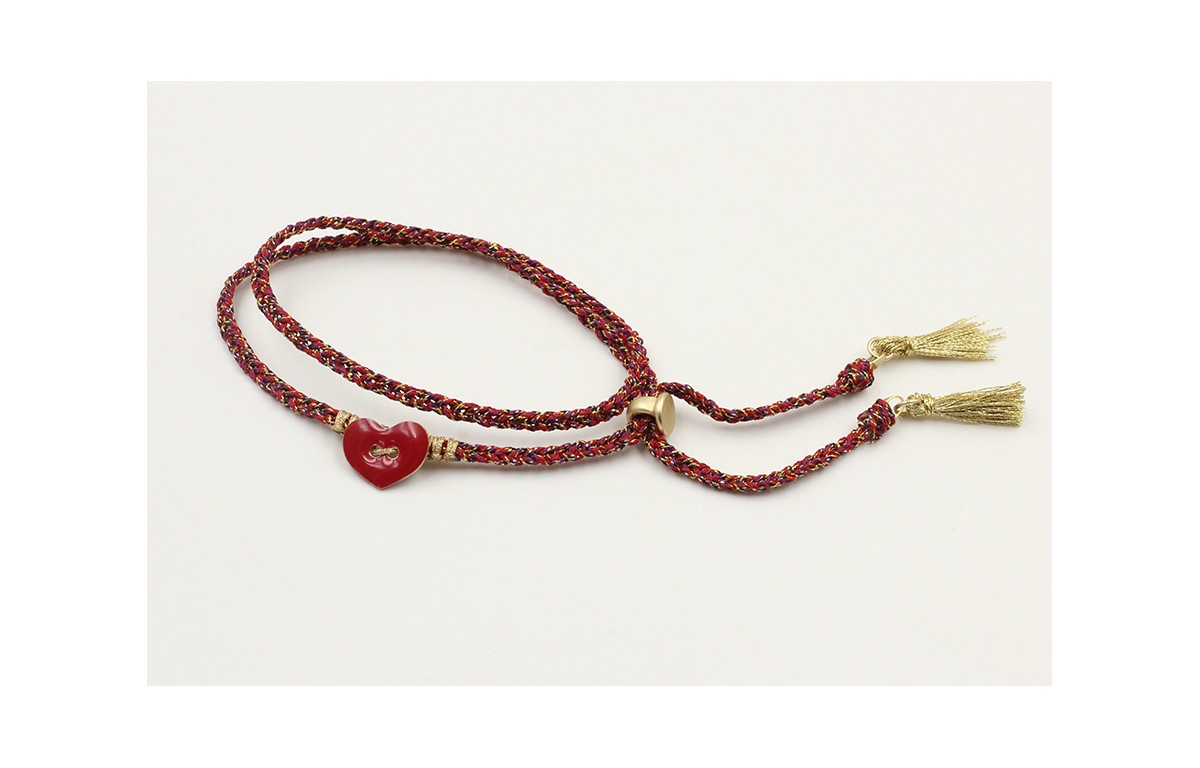 Pulsera trenzada hilo rojo vivo y oro con chapa corazón dos agujeros rojo rematado en dos pompones metalicos dorados.