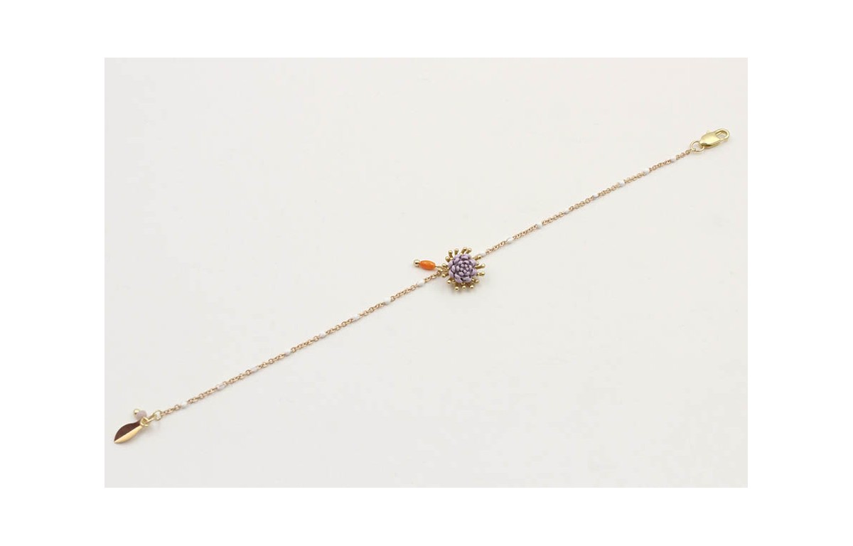 Pulsera cadena bola esmaltada blanca con flor lila,casquilla oro mate y ovalo coral. Largo 17cm.