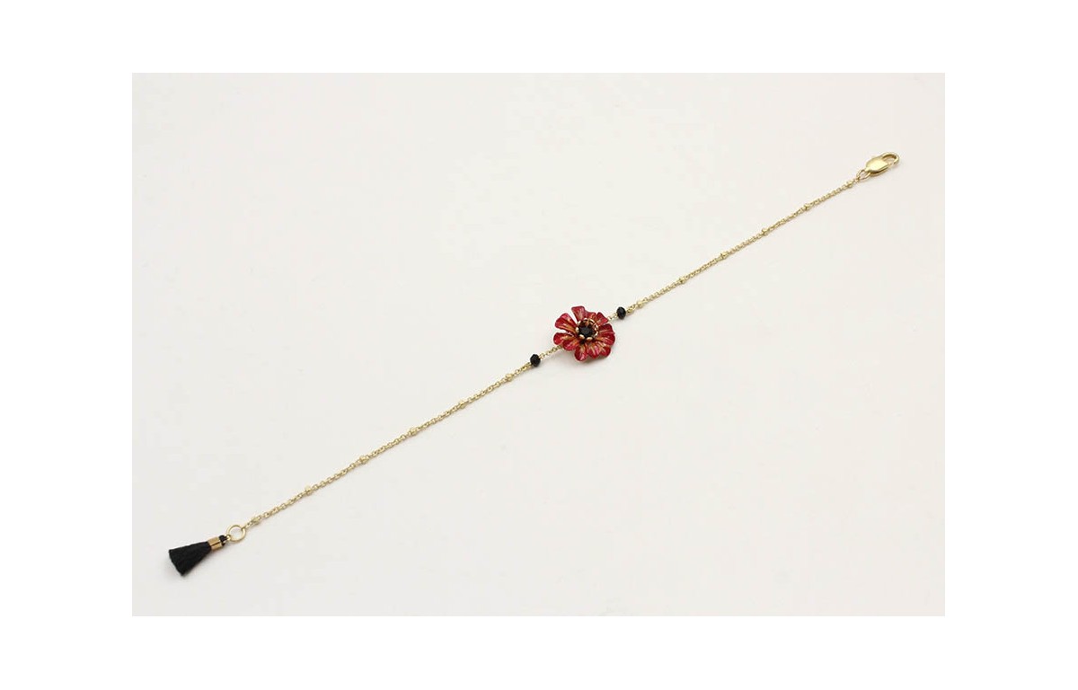 Pulsera cadena microbola oro amte con flor esmaltada roja y rematada con micropompon negro. Largo 17cm.