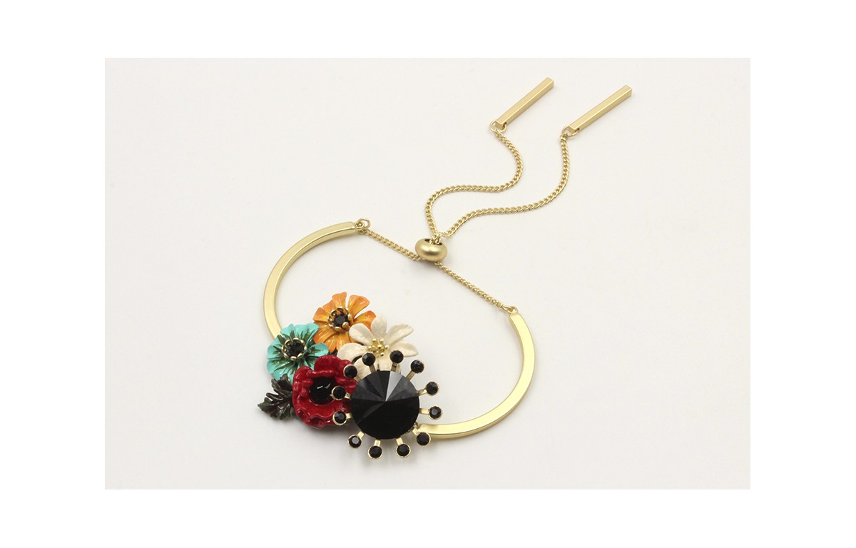 Pulsera semirigida oro mate con centro de flores esmaltadas en rojo,blanca,amarilla,roja y brillo negro. Es regulable.