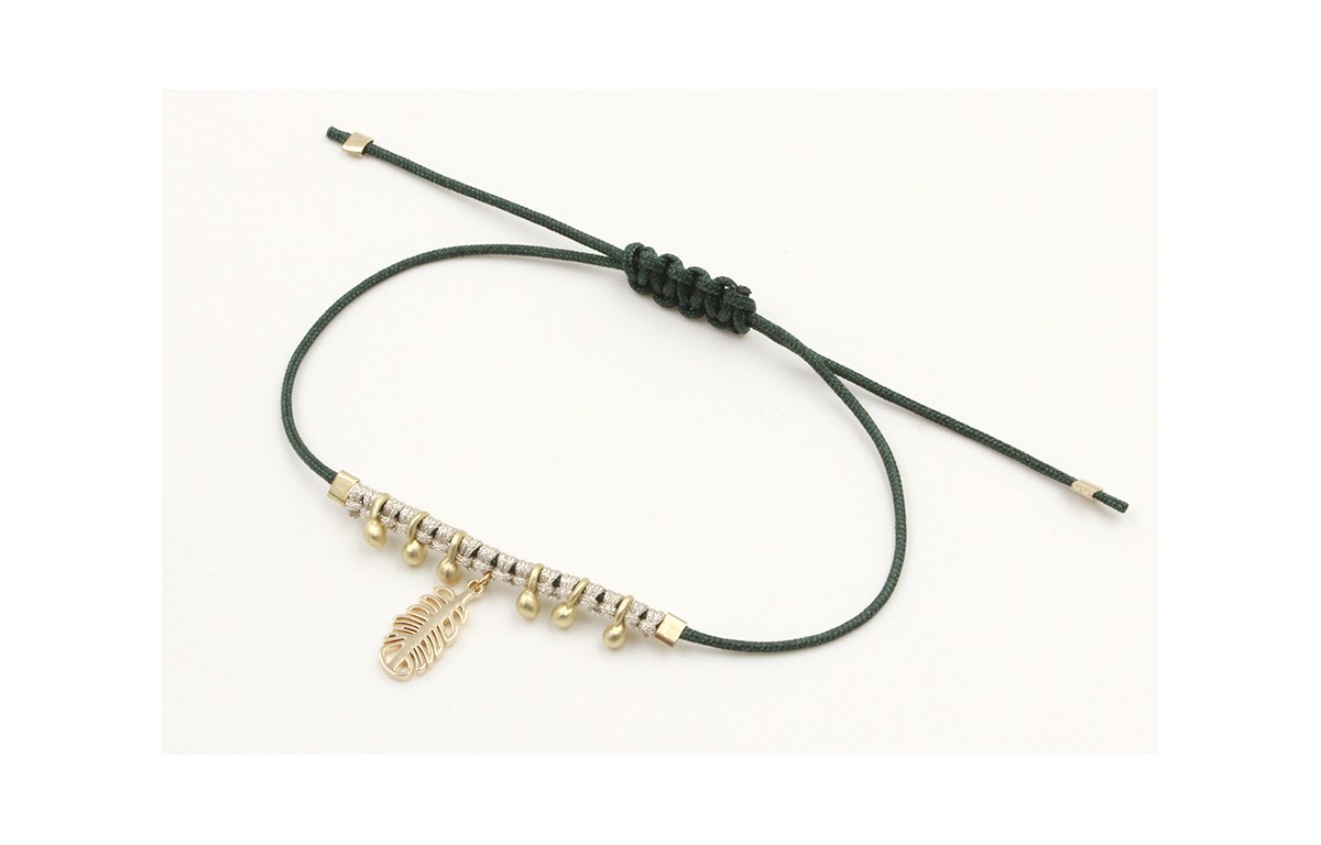 Pulsera hilo macarme verde con nudo macrame plateado, colgante hojita calada acero inoxidable y bolitas oro mate. Es regulable.