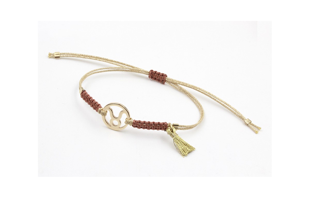 Pulsera hilo macrame oro palido con nudo oro rosa disco zodiaco Tauro y pompon metalico dorado. Es regulable.