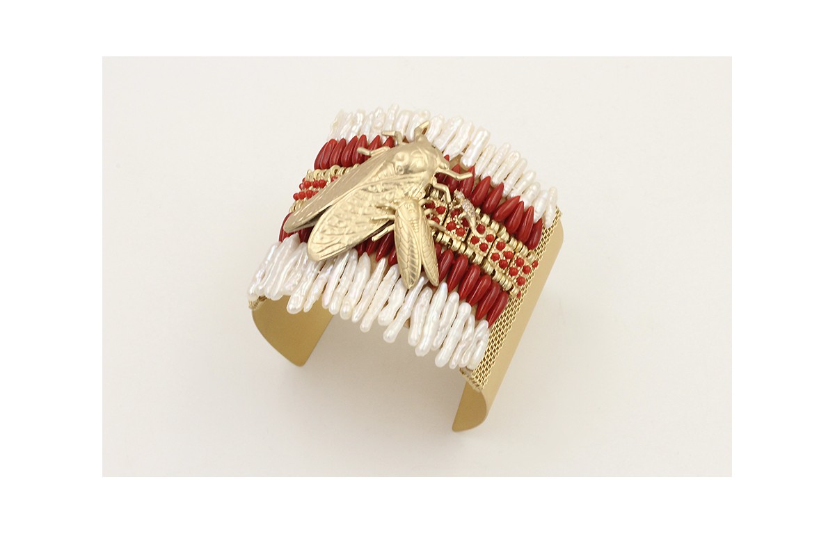 Brazalete etnico con listones de perlas, gotas coral, cigarras grande y pequeña dorada mate, lagarto brillos cristal y rematada en cadena tira plana.