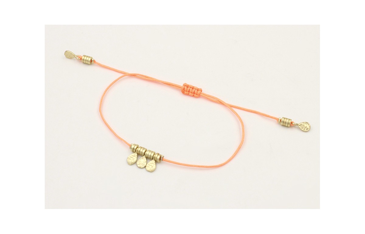 Pulsera hilo naranja fluor con colgantes laminas labradas y ruedas doradas mate. Es regulable