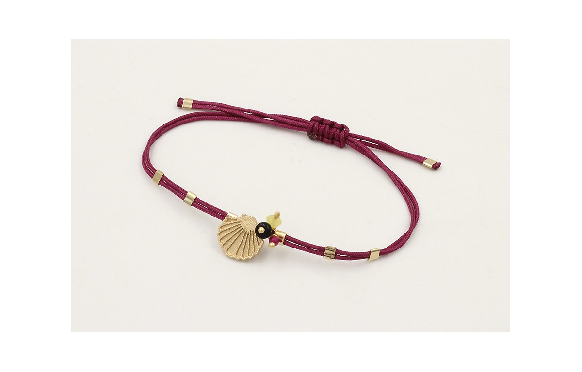 Pulsera hilo granate con tubitos aplastados, concha y abalorios colgando. Es regulable.