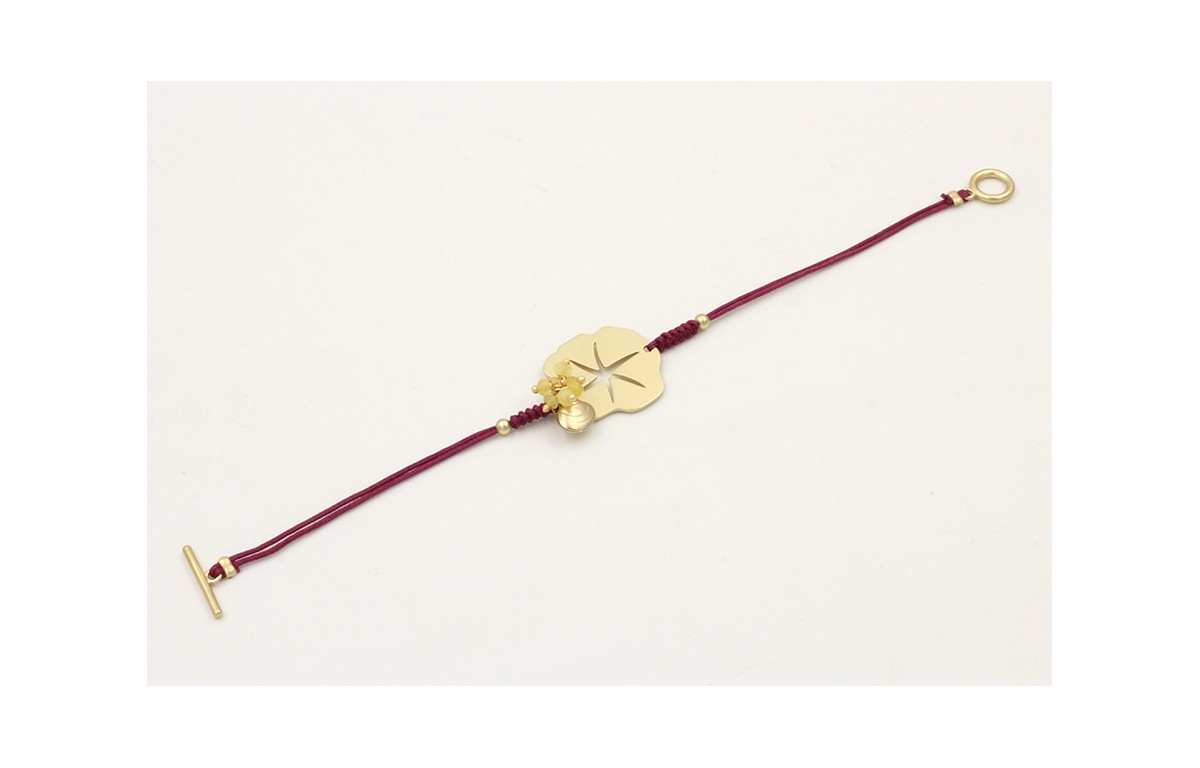 Pulsera de hilo granate con chapa estrella labrada y almeja pequeña con cierre marinero pequeño. Largo 17cm