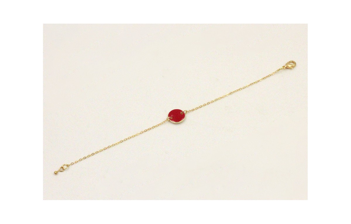Pulsera cadena eslabón pequeño dorado con circulo 2 agujeros esmaltado rojo. Largo 17cm.