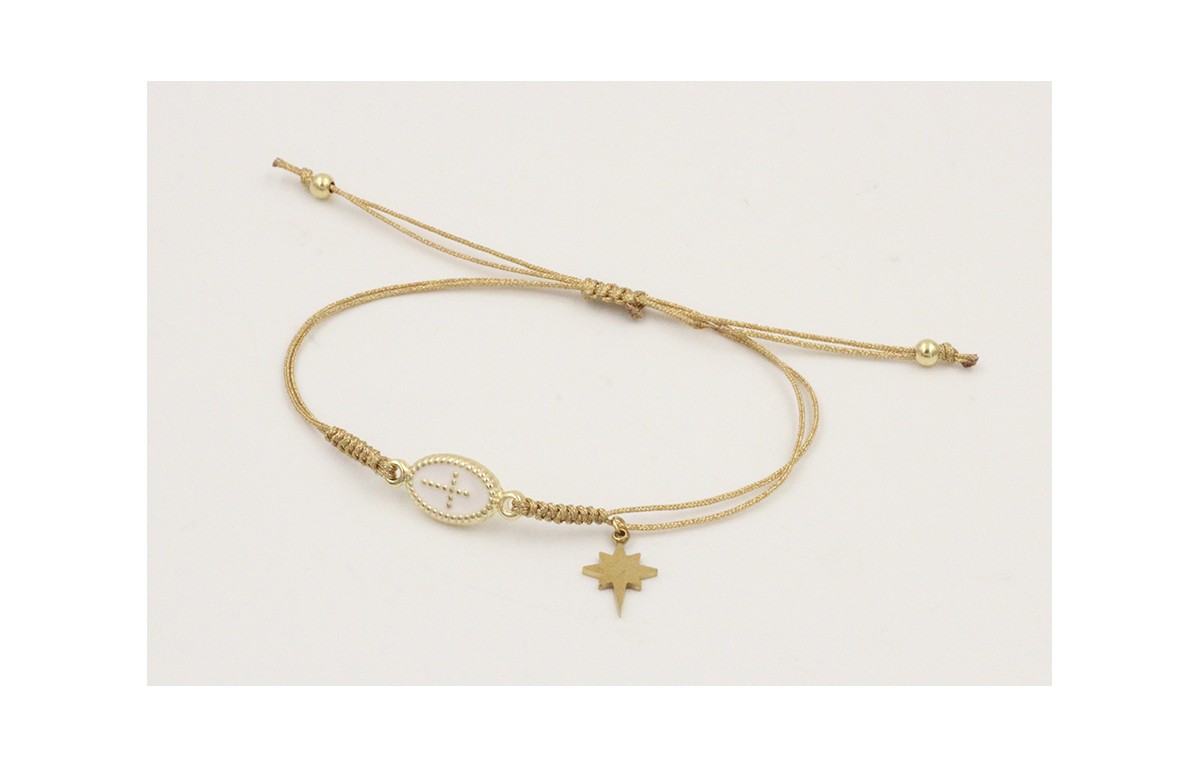 Pulsera hilo dorado palido con entrepieza cruz esmaltada blanca y brújula colgando. Es regulable