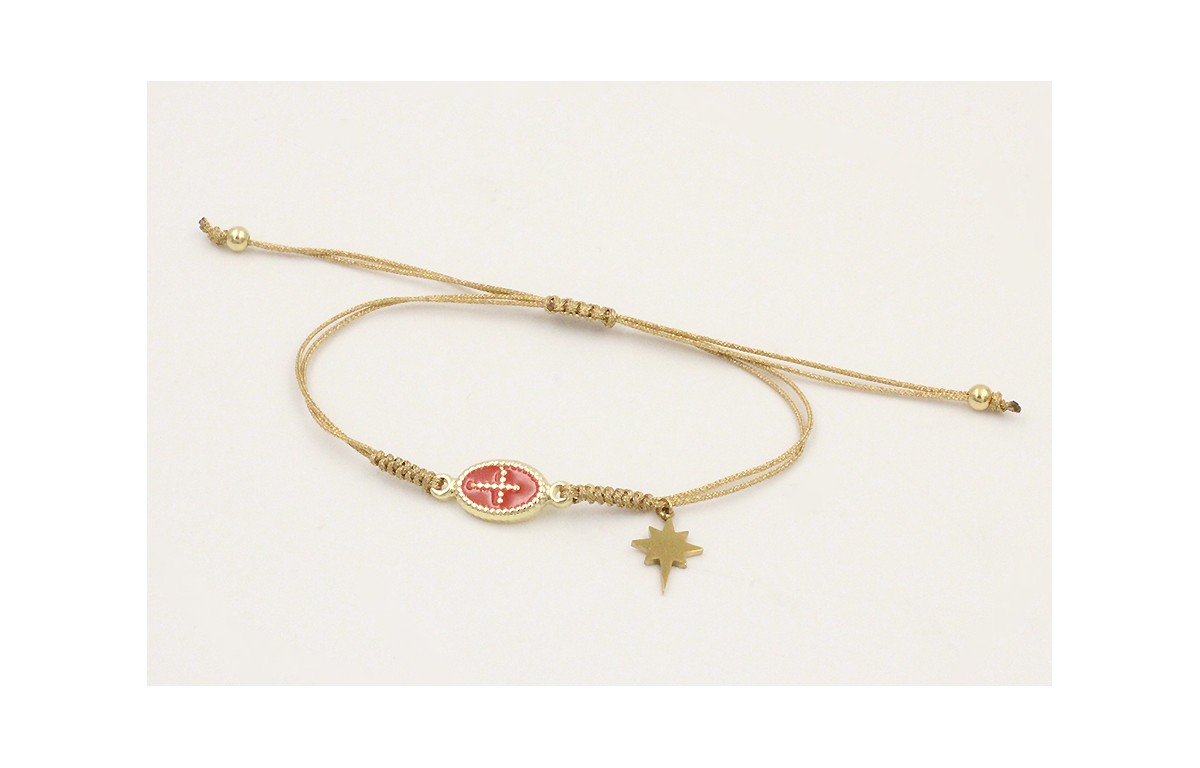 Pulsera hilo dorado palido con entrepieza cruz esmaltada rosa y brújula colgando. Es regulable