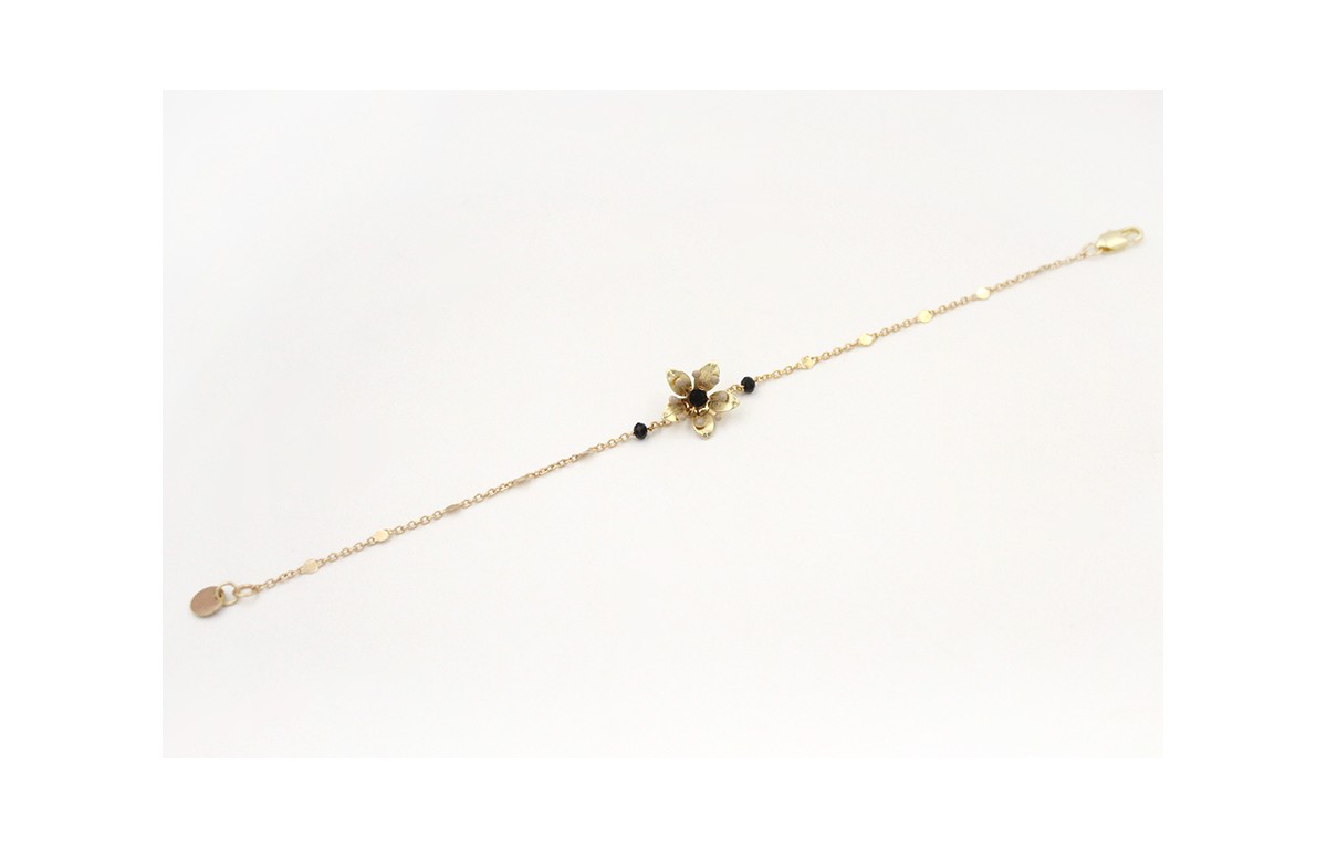 Pulsera cadena con chapitas oro mate con facetas negras y flor oro mate con brillo negro. Largo 17cm.