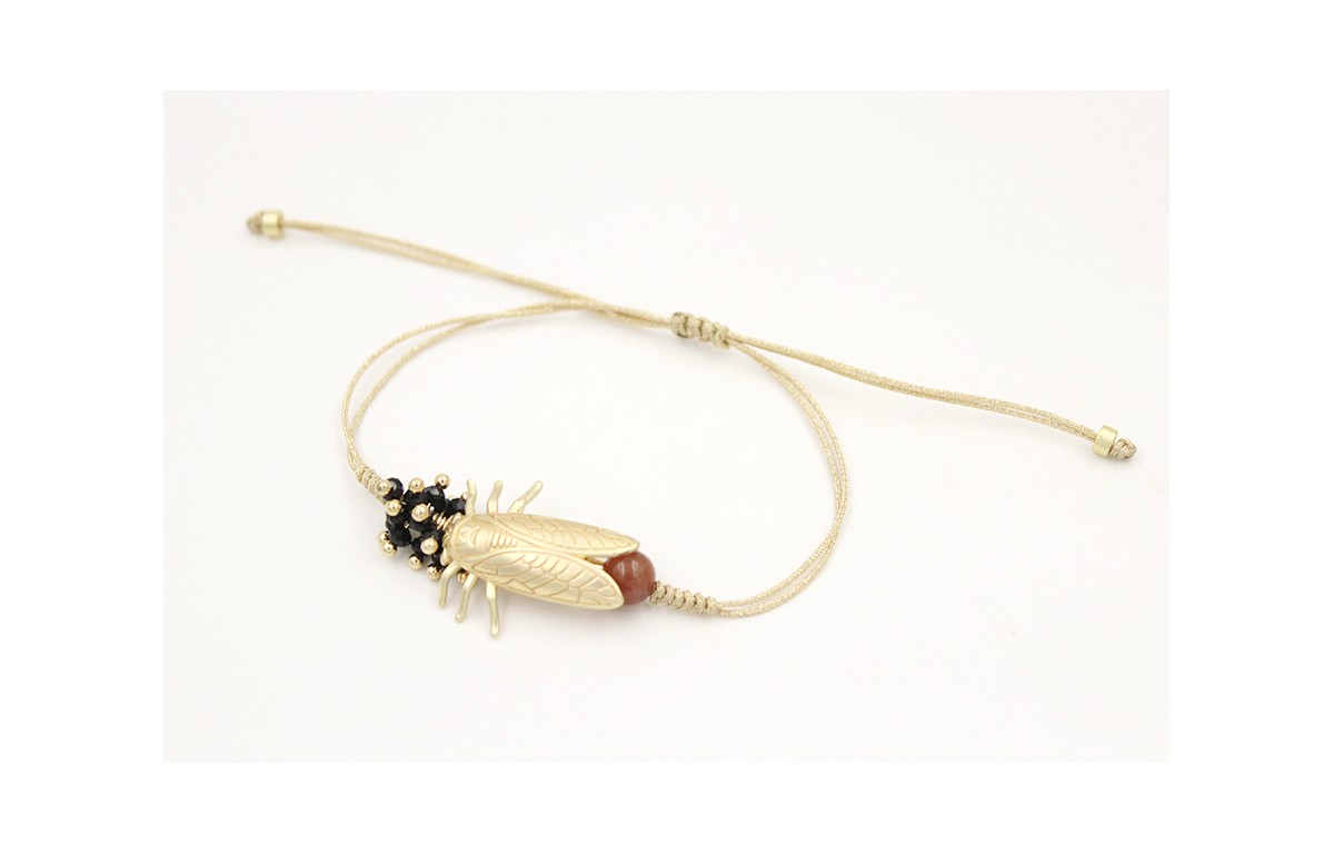 Pulsera nudo corredizo con cigarra oro mate,burruño facetadas negras y bola. Es regulable.