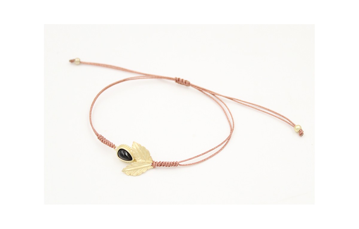Pulsera hilo macramé oro rosa con entrepieza piedra negra y hoja doble en oro mate. Es regulable.