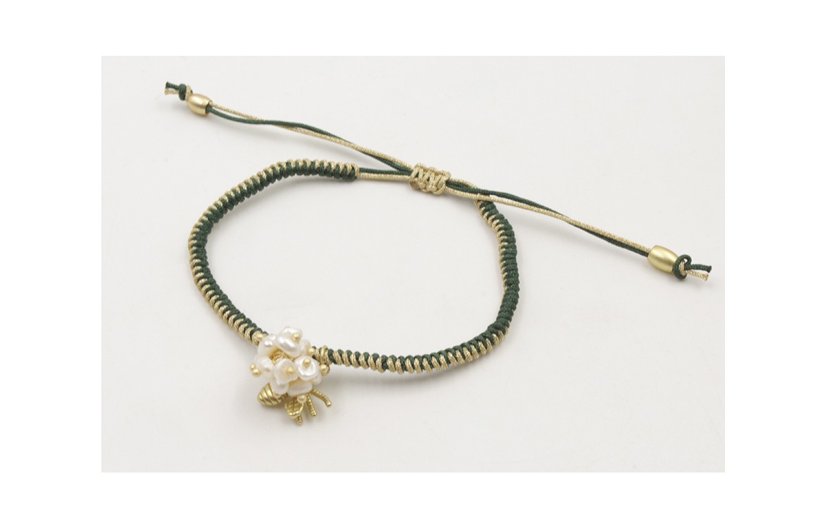 Pulsera hilo con nudo serpiente mitad verde mitad dorada, colgante abeja dorada mate y burruño perlas naturales. Es regulable.