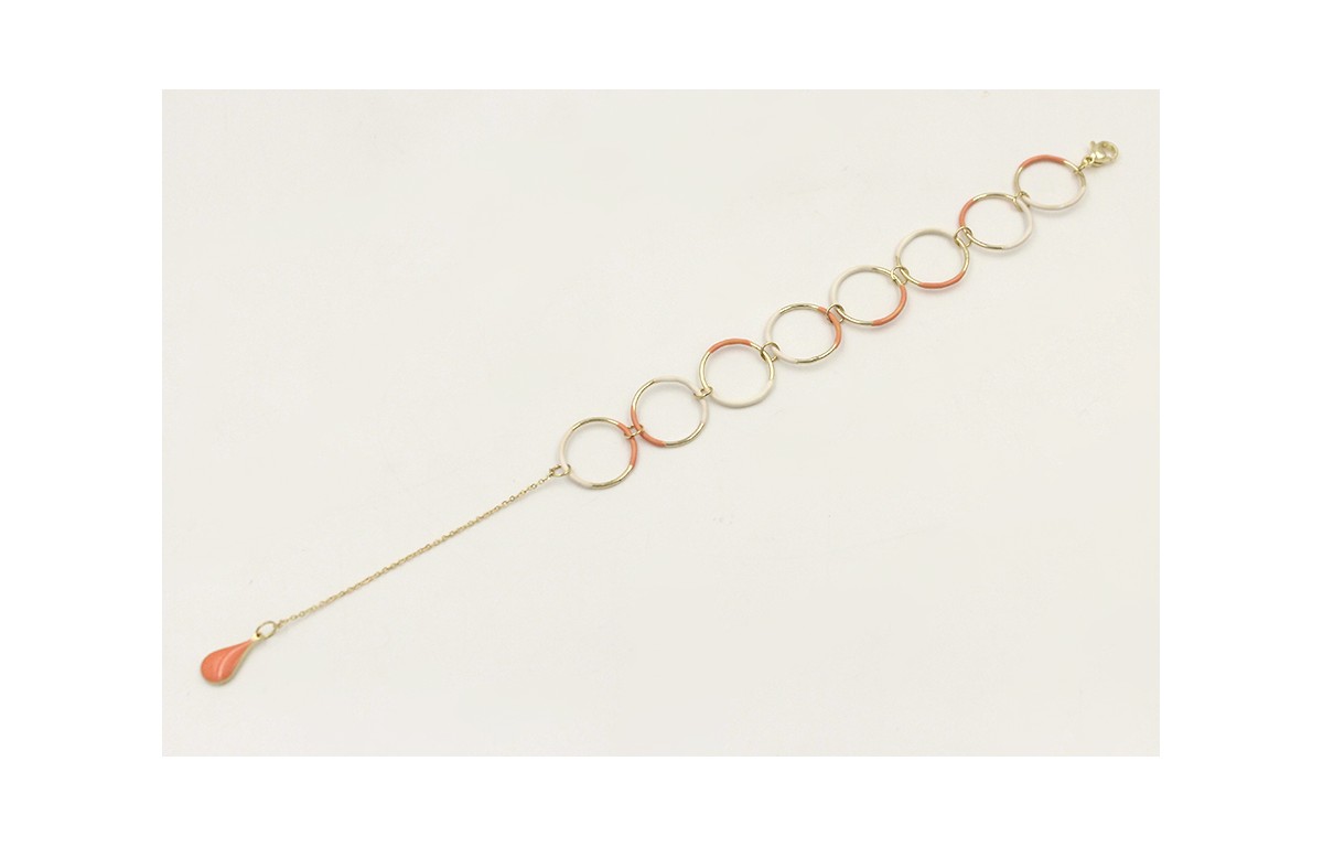 Pulsera de acero inoxidable con arandelas esmaltadas salmón y beige rematado con gota esmaltada salmón. Largo 17cm.