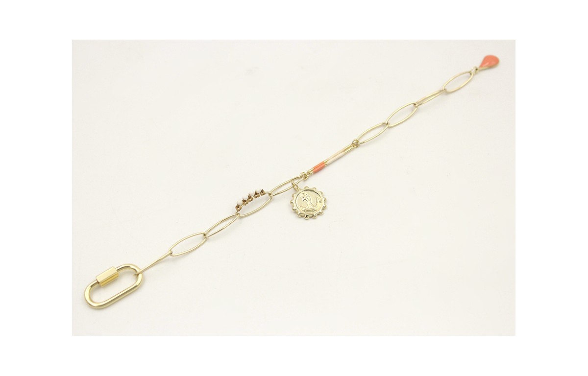 Pulsera acero inoxidable de cadena eslabón ovalado colgante disco estriado ancla, palitos salmón y beige eslabón forrado nudo hilo dorado,cierre eslabón rematada con gota esmaltada salmón. Largo 17cm.